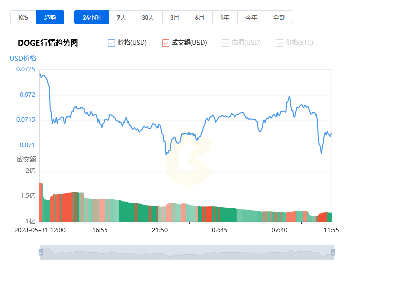 | 2023年6月1日 | 0.071325 | 0.071659 | 0.071953 | 0.070783 | 577.55M | -0.47% |